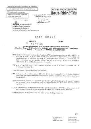 portant notification de la décision d'autorisation budgétaire et fixation du prix de journée 2016 du foyer pour adultes handicapés travailleurs (FAHT) de l'association "AFAPEI" à BARTENHEIM Resumé Pièces jointes ARRETE Assemblée : Non défini Date : 03/05/2016 Rapporteur : Non défini Collectivité : Conseil départemental du Haut-Rhin Direction : Non défini Service : Direction de la Solidarité Domaine : Prix de Journée Commission :