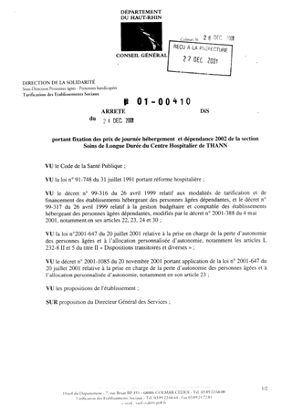 Portant fixation des prix de journée hébergement et dépendance 2002 de la section Soins de Longue Durée du Centre Hospitalier de THANN Resumé Pièces jointes ARRETE Assemblée : Non défini Date : 24/12/2001 Rapporteur : Non défini Collectivité : Conseil départemental du Haut-Rhin Direction : Non défini Service : Direction de la Solidarité Domaine : Prix de Journée Commission :