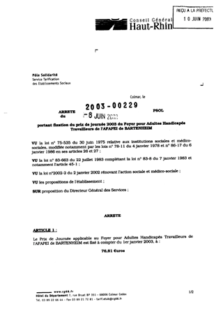 portant fixation du prix de journée 2003 du foyer pour adultes handicapés travailleurs de l'AFAPEI de BARTENHEIM. Resumé Pièces jointes ARRETE Assemblée : Non défini Date : 06/06/2003 Rapporteur : Non défini Collectivité : Conseil départemental du Haut-Rhin Direction : Non défini Service : Service de la Tarification des Etablissements Domaine : Prix de Journée Commission :