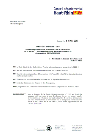 portant règlementation permanente de la circulation sur la RD 15 I, hors agglomération, sur le territoire de la commune de GUNDOLSHEIM Resumé Pièces jointes ARRETE Assemblée : Non défini Date : 10/05/2016 Rapporteur : Non défini Collectivité : Conseil départemental du Haut-Rhin Direction : Non défini Service : Direction d'Appuis Juridique et Documentaire Domaine : Circulation Commission :