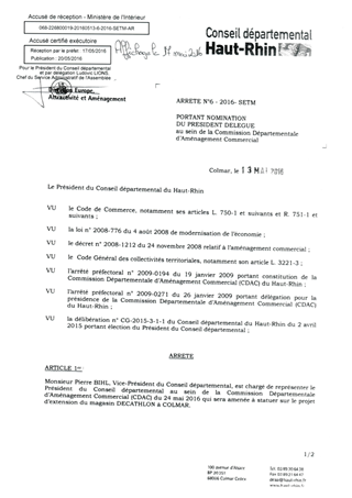 portant nomination du Président délégué au sein de la Commission Départementale d'Aménagement Commercial Resumé Pièces jointes ARRETE Assemblée : Non défini Date : 13/05/2016 Rapporteur : Non défini Collectivité : Conseil départemental du Haut-Rhin Direction : Non défini Service : Direction Europe Attractivité et Aménagement Domaine : Autres (non classés) Commission :