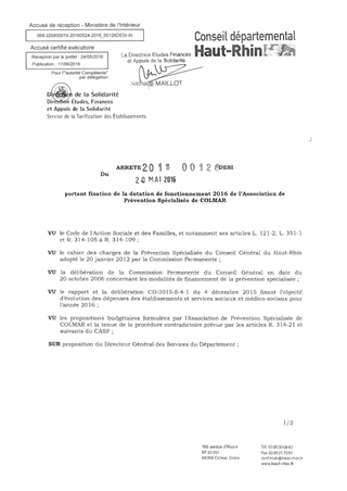 portant fixation de la dotation de fonctionnement 2016 de l'association de prévention spécialisée de COLMAR Resumé Pièces jointes ARRETE Assemblée : Non défini Date : 20/05/2016 Rapporteur : Non défini Collectivité : Conseil départemental du Haut-Rhin Direction : Non défini Service : Direction Etudes, Finances et Appuis de la Solidarité Domaine : Dotations financières Commission :
