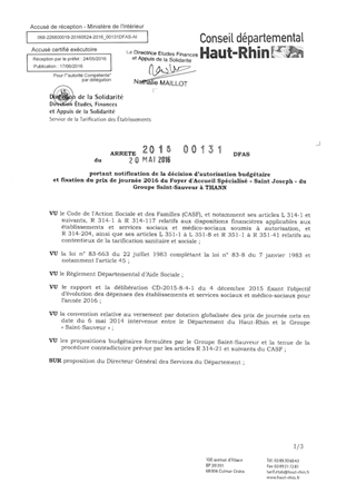 portant notification de la décision d'autorisation budgétaire et fixation du prix de journée 2016 du foyer d'accueil spécialisé "Saint Joseph" du groupe Saint-Sauveur à THANN Resumé Pièces jointes ARRETE Assemblée : Non défini Date : 20/05/2016 Rapporteur : Non défini Collectivité : Conseil départemental du Haut-Rhin Direction : Non défini Service : Direction Etudes, Finances et Appuis de la Solidarité Domaine : Prix de Journée Commission :
