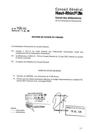Un crédit de 9000 € a été inscrit au Budget Primitif en faveur du CERARE, Association basée à Mulhouse qui se consacre à la sauvegarde d’archives économiques privées. Il vous est proposé de vous prononcer sur l’octroi de cette subvention qui servira au classement des Archives de la Société HEILMANN-KOECHLIN & Compagnie.