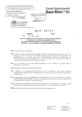 portant notification de la décision d'autorisation budgétaire et fixation de la dotation globalisée 2016 du service d'accompagnement à la vie sociale (SAVS) de l'institut "Les Tournesols" à SAINTE MARIE AUX MINES Resumé Pièces jointes ARRETE Assemblée : Non défini Date : 26/05/2016 Rapporteur : Non défini Collectivité : Conseil départemental du Haut-Rhin Direction : Non défini Service : Direction Etudes, Finances et Appuis de la Solidarité Domaine : Dotations financières Commission :