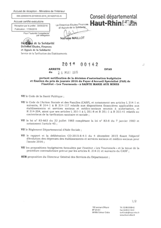 portant notification de la décision d'autorisation budgétaire et fixation du prix de journée 2016 du foyer d'accueil spécialisé (FAS) de l'institut "Les Tournesols" à SAINTE MARIE AUX MINES Resumé Pièces jointes ARRETE Assemblée : Non défini Date : 26/05/2016 Rapporteur : Non défini Collectivité : Conseil départemental du Haut-Rhin Direction : Non défini Service : Direction Etudes, Finances et Appuis de la Solidarité Domaine : Prix de Journée Commission :