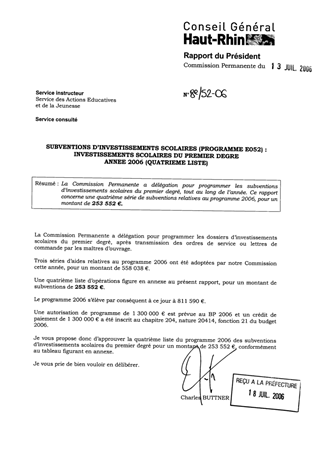 La Commission Permanente a délégation pour programmer les subventions d’investissements scolaires du premier degré, tout au long de l’année. Ce rapport concerne une quatrième série de subventions relatives au programme 2006, pour un montant de 253 552 €.