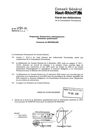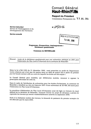 Levée de la déchéance quadriennale pour une subvention attribuée en 2001 pour l’élaboration du Plan Local d’Urbanisme de la commune de Retzwiller.