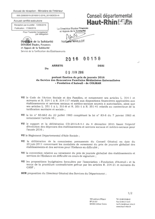 portant fixation du prix de journée 2016 du service des rencontres familiales médiatisées externalisées "Fondation d'Auteuil" de COLMAR Resumé Pièces jointes ARRETE Assemblée : Non défini Date : 09/06/2016 Rapporteur : Non défini Collectivité : Conseil départemental du Haut-Rhin Direction : Non défini Service : Direction Etudes, Finances et Appuis de la Solidarité Domaine : Prix de Journée Commission :