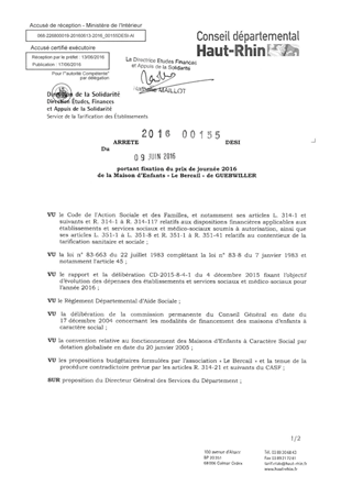 portant fixation du prix de journée 2016 de la maison d'enfants "Le Bercail" de GUEBWILLER Resumé Pièces jointes ARRETE Assemblée : Non défini Date : 09/06/2016 Rapporteur : Non défini Collectivité : Conseil départemental du Haut-Rhin Direction : Non défini Service : Direction Etudes, Finances et Appuis de la Solidarité Domaine : Prix de Journée Commission :