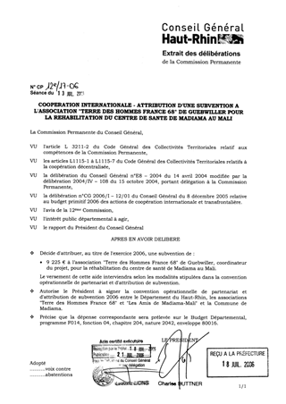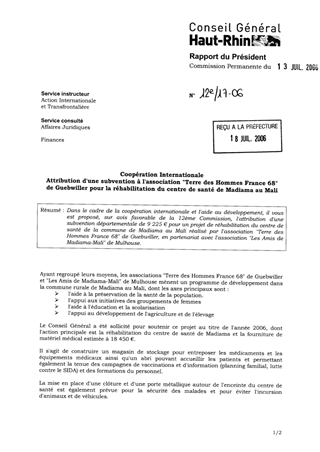 Dans le cadre de la coopération internationale et l'aide au développement, il vous est proposé, sur avis favorable de la 12ème Commission, l'attribution d'une subvention départementale de 9 225 € pour un projet de réhabilitation du centre de santé de la commune de Madiama au Mali réalisé par l'association "Terre des Hommes France 68" de Guebwiller, en partenariat avec l'association "Les Amis de Madiama-Mali" de Mulhouse.