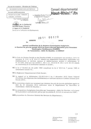 portant notification de la décision d'autorisation budgétaire et fixation du prix de journée 2016 du foyer d'accueil spécialisé pour personnes handicapées vieillissantes (FASPHV) de l'association "Adèle de Glaubitz" à CERNAY Resumé Pièces jointes ARRETE Assemblée : Non défini Date : 14/06/2016 Rapporteur : Non défini Collectivité : Conseil départemental du Haut-Rhin Direction : Non défini Service : Direction Etudes, Finances et Appuis de la Solidarité Domaine : Prix de Journée Commission :