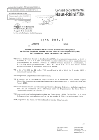 portant notification de la décision d'autorisation budgétaire et fixation du prix de journée 2016 du foyer d'accueil spécialisé (FAS) de l'association "Adèle de Glaubitz" à CERNAY Resumé Pièces jointes ARRETE Assemblée : Non défini Date : 14/06/2016 Rapporteur : Non défini Collectivité : Conseil départemental du Haut-Rhin Direction : Non défini Service : Direction Etudes, Finances et Appuis de la Solidarité Domaine : Prix de Journée Commission :