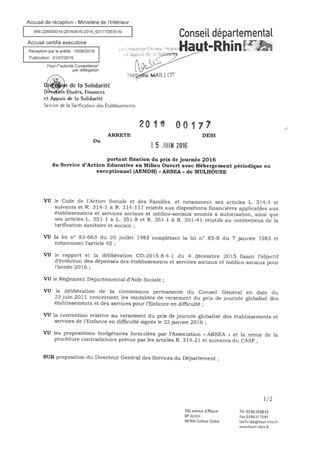 portant fixation du prix de journée 2016 du service d'action éducative en milieu ouvert avec hébergement périodique ou exceptionnel (AEMOH) "ARSEA" de MULHOUSE Resumé Pièces jointes ARRETE Assemblée : Non défini Date : 15/06/2016 Rapporteur : Non défini Collectivité : Conseil départemental du Haut-Rhin Direction : Non défini Service : Direction Etudes, Finances et Appuis de la Solidarité Domaine : Prix de Journée Commission :