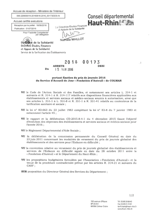 portant fixation du prix de journée 2016 du service d'accueil de jour "Fondation d'Auteuil" de COLMAR Resumé Pièces jointes ARRETE Assemblée : Non défini Date : 15/06/2016 Rapporteur : Non défini Collectivité : Conseil départemental du Haut-Rhin Direction : Non défini Service : Direction Etudes, Finances et Appuis de la Solidarité Domaine : Prix de Journée Commission :