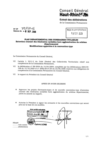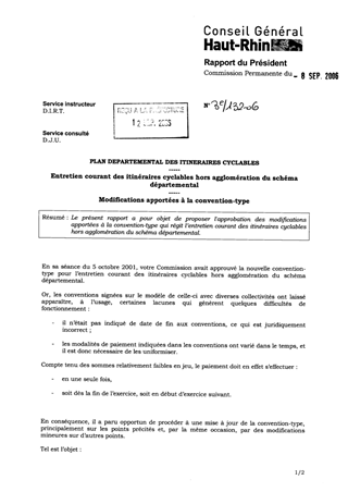 Plan départemental des itinéraires cyclables. Entretien courant des itinéraires cyclables hors agglomération du schéma départemental. Modifications apportées à la convention type