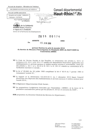 portant fixation du prix de journée 2016 du service de mesures d'investigation de proximité (MIP) du Haut-Rhin de l'association ARSEA Resumé Pièces jointes ARRETE Assemblée : Non défini Date : 15/06/2016 Rapporteur : Non défini Collectivité : Conseil départemental du Haut-Rhin Direction : Non défini Service : Direction Etudes, Finances et Appuis de la Solidarité Domaine : Prix de Journée Commission :