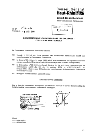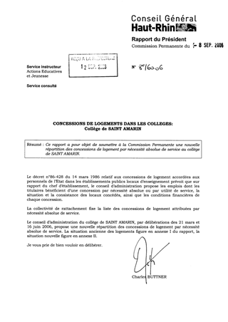 Ce rapport a pour objet de soumettre à la Commission Permanente une nouvelle répartition des concessions de logement par nécessité absolue de service au collège de SAINT AMARIN.