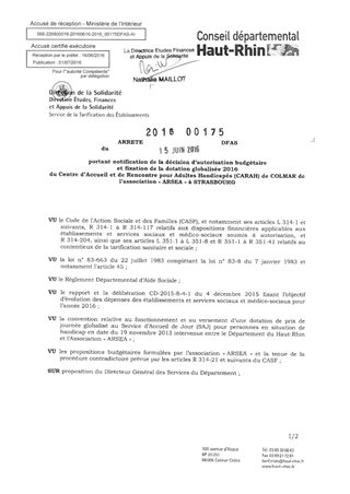 portant notification de la décision d'autorisation budgétaire et fixation de la dotation globalisée 2016 du centre d'accueil et de rencontre pour adultes handicapés (CARAH) de COLMAR de l'association "ARSEA" à STRASBOURG Resumé Pièces jointes ARRETE Assemblée : Non défini Date : 15/06/2016 Rapporteur : Non défini Collectivité : Conseil départemental du Haut-Rhin Direction : Non défini Service : Direction Etudes, Finances et Appuis de la Solidarité Domaine : Dotations financières Commission :