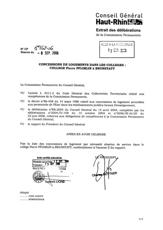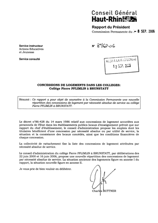 Ce rapport a pour objet de soumettre à la Commission Permanente une nouvelle répartition des concessions de logement par nécessité absolue de service au collège Pierre PFLIMLIN à BRUNSTATT.