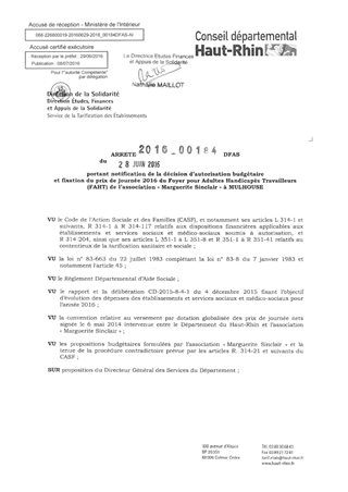 portant notification de la décision d'autorisation budgétaire et fixation du prix de journée 2016 du foyer pour adultes handicapés travailleurs (FAHT) de l'association "Marguerite Sinclair" à MULHOUSE Resumé Pièces jointes ARRETE Assemblée : Non défini Date : 28/06/2016 Rapporteur : Non défini Collectivité : Conseil départemental du Haut-Rhin Direction : Non défini Service : Direction Etudes, Finances et Appuis de la Solidarité Domaine : Prix de Journée Commission :
