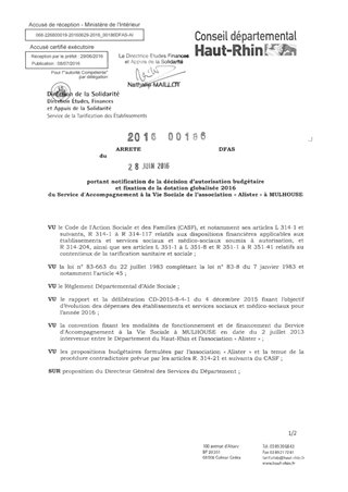 portant notification de la décision d'autorisation budgétaire et fixation de la dotation globale 2016 du service d'accompagnement à la vie sociale de l'association "Alister" à MULHOUSE Resumé Pièces jointes ARRETE Assemblée : Non défini Date : 28/06/2016 Rapporteur : Non défini Collectivité : Conseil départemental du Haut-Rhin Direction : Non défini Service : Direction Etudes, Finances et Appuis de la Solidarité Domaine : Dotations financières Commission :