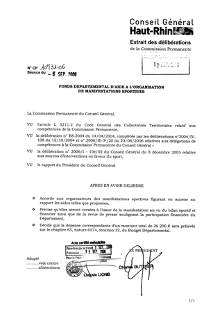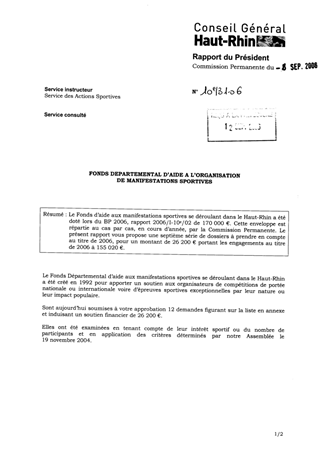 Le Fonds d’aide aux manifestations sportives se déroulant dans le Haut-Rhin a été doté lors du BP 2006, rapport 2006/I-10e/02 de 170 000 €. Cette enveloppe est répartie au cas par cas, en cours d’année, par la Commission Permanente. Le présent rapport vous propose une septième série de dossiers à prendre en compte au titre de 2006, pour un montant de 26 200 € portant les engagements au titre de 2006 à 155 020 €.