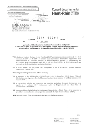 portant notification de la décision d'autorisation budgétaire et fixation du prix de journée 2016 du foyer d'accueil spécialisé pour personnes handicapées vieillissantes de l'association "Marie Pire" à ALTKIRCH Resumé Pièces jointes ARRETE Assemblée : Non défini Date : 01/07/2016 Rapporteur : Non défini Collectivité : Conseil départemental du Haut-Rhin Direction : Non défini Service : Direction Etudes, Finances et Appuis de la Solidarité Domaine : Prix de Journée Commission :