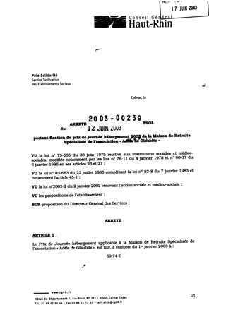 portant fixation du prix de journée hébergement 2003 de la maison de retraite spécialisée de l'association "Adèle de Glaubitz". Resumé Pièces jointes ARRETE Assemblée : Non défini Date : 12/06/2003 Rapporteur : Non défini Collectivité : Conseil départemental du Haut-Rhin Direction : Non défini Service : Service de la Tarification des Etablissements Domaine : Prix de Journée Commission :
