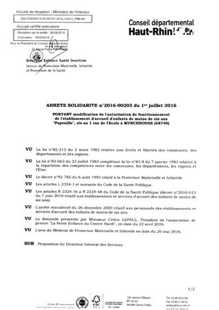 portant modification de l'autorisation de fonctionnement de l'établissement d'accueil d'enfants de moins de six ans "Papouille", sis au 1 rue de l'Ecole à MUNCHHOUSE (68740) Resumé Pièces jointes ARRETE Assemblée : Non défini Date : 01/07/2016 Rapporteur : Non défini Collectivité : Conseil départemental du Haut-Rhin Direction : Non défini Service : Direction Enfance Santé Insertion Domaine : Accueil d'enfants Commission :