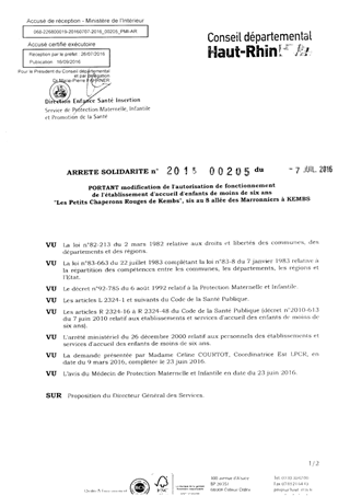 portant modification de l'autorisation de fonctionnement de l'établissement d'accueil d'enfants de moins de six ans "Les Petits Chaperons Rouges de Kembs", sis au 8 allée des Marronniers à KEMBS Resumé Pièces jointes ARRETE Assemblée : Non défini Date : 07/07/2016 Rapporteur : Non défini Collectivité : Conseil départemental du Haut-Rhin Direction : Non défini Service : Direction Enfance Santé Insertion Domaine : Accueil d'enfants Commission :