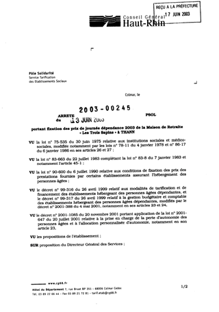 portant fixation des prix de journée dépendance 2003 de la maison de retraite "Les Trois Sapins" à THANN. Resumé Pièces jointes ARRETE Assemblée : Non défini Date : 13/06/2003 Rapporteur : Non défini Collectivité : Conseil départemental du Haut-Rhin Direction : Non défini Service : Service de la Tarification des Etablissements Domaine : Prix de Journée Commission :