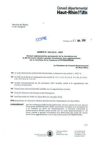 portant réglementation permanente de la circulation sur la RD 52 (route classée à grande circulation), hors agglomération, sur le territoire de la commune d'OTTMARSHEIM Resumé Pièces jointes ARRETE Assemblée : Non défini Date : 27/07/2016 Rapporteur : Non défini Collectivité : Conseil départemental du Haut-Rhin Direction : Non défini Service : Direction des Routes Domaine : Circulation Commission :
