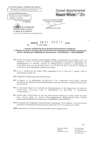 portant notification de la décision d'autorisation budgétaire et fixation du prix de journée 2016 du service d'accompagnement médico-social pour adultes handicapés (SAMSAH) de l'association "Croix Marine" à WITTENHEIM Resumé Pièces jointes ARRETE Assemblée : Non défini Date : 04/08/2016 Rapporteur : Non défini Collectivité : Conseil départemental du Haut-Rhin Direction : Non défini Service : Direction Etudes, Finances et Appuis de la Solidarité Domaine : Prix de Journée Commission :