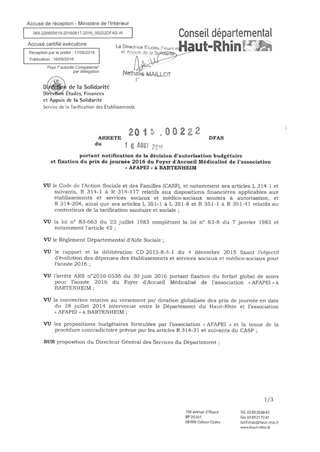 portant notification de la décision d'autorisation budgétaire et fixation du prix de journée 2016 du foyer d'accueil médicalisé de l'association "AFAPEI" à BARTENHEIM Resumé Pièces jointes ARRETE Assemblée : Non défini Date : 16/08/2016 Rapporteur : Non défini Collectivité : Conseil départemental du Haut-Rhin Direction : Non défini Service : Direction Etudes, Finances et Appuis de la Solidarité Domaine : Prix de Journée Commission :
