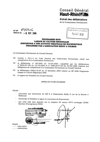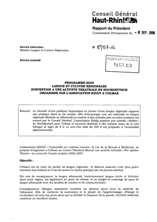 La réussite d’une politique linguistique en faveur d’une langue régionale suppose une pratique dans la vie sociale. Afin d’encourager une vie culturelle en langue régionale (dialecte ou allemand) un soutien à des activités péri ou extra scolaires est assuré par le Conseil Général. L’association Kiddy propose une activité « théâtre » en Hochdeutsch pour Colmar et environs destinée à des enfants issus de la voie bilingue et âgés de 8 à 12 ans Une aide de 300 € est proposée à l’assemblée départementale.