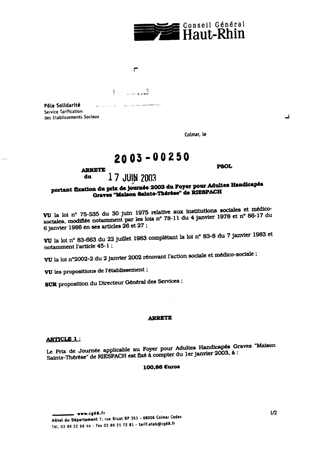 portant fixation du prix de journée 2003 du foyer pour adultes handicapés graves "Maison Sainte-Thérèse" de RIESPACH. Resumé Pièces jointes ARRETE Assemblée : Non défini Date : 17/06/2003 Rapporteur : Non défini Collectivité : Conseil départemental du Haut-Rhin Direction : Non défini Service : Service de la Tarification des Etablissements Domaine : Prix de Journée Commission :