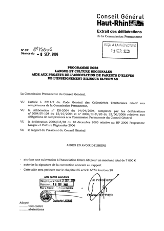 L’Association ELTERN 68 sollicite une aide départementale pour ses différents projets. Il est proposé de fixer l’aide attribuée à 7 000 € pour l’année 2006 dans le cadre d’une convention limitée aux actions assurant la promotion de l’enseignement bilingue.