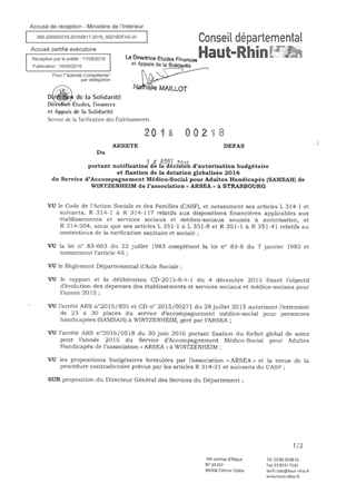 portant notification de la décision d'autorisation budgétaire et fixation de la dotation globalisée 2016 du service d'accompagnement médico-social pour adultes handicapés (SAMSAH) de WINTZENHEIM de l'association "ARSEA" à STRASBOURG Resumé Pièces jointes ARRETE Assemblée : Non défini Date : 16/08/2016 Rapporteur : Non défini Collectivité : Conseil départemental du Haut-Rhin Direction : Non défini Service : Direction Etudes, Finances et Appuis de la Solidarité Domaine : Dotations financières Commission :