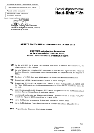 portant autorisation d'ouverture de la micro-crèche "Jules et Rose", sis au 1 route de Bâle à COLMAR (68000) Resumé Pièces jointes ARRETE Assemblée : Non défini Date : 19/08/2016 Rapporteur : Non défini Collectivité : Conseil départemental du Haut-Rhin Direction : Non défini Service : Direction Enfance Santé Insertion Domaine : Accueil d'enfants Commission :