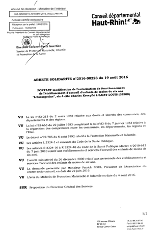 portant modification de l'autorisation de fonctionnement de l'établissement d'accueil d'enfants de moins de six ans "L'Escargotine", sis 4 cité Charles Kroepflé à SAINT-LOUIS (68300) Resumé Pièces jointes ARRETE Assemblée : Non défini Date : 19/08/2016 Rapporteur : Non défini Collectivité : Conseil départemental du Haut-Rhin Direction : Non défini Service : Direction Enfance Santé Insertion Domaine : Accueil d'enfants Commission :