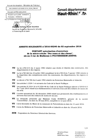 portant autorisation d'ouverture de la micro-crèche "Des roses et des choux", sis au 3 rue de Mulhouse à PULVERSHEIM (68840) Resumé Pièces jointes ARRETE Assemblée : Non défini Date : 02/09/2016 Rapporteur : Non défini Collectivité : Conseil départemental du Haut-Rhin Direction : Non défini Service : Direction Enfance Santé Insertion Domaine : Accueil d'enfants Commission :