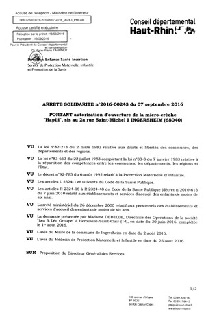 portant autorisation d'ouverture de la micro-crèche "Hapili", sis au 2a rue Saint-Michel à INGERSHEIM (68040) Resumé Pièces jointes ARRETE Assemblée : Non défini Date : 07/09/2016 Rapporteur : Non défini Collectivité : Conseil départemental du Haut-Rhin Direction : Non défini Service : Direction Enfance Santé Insertion Domaine : Accueil d'enfants Commission :