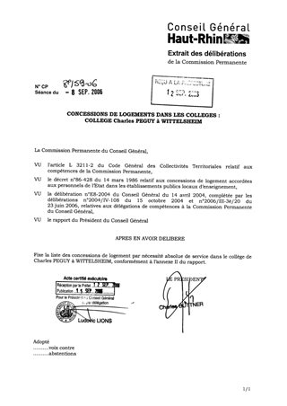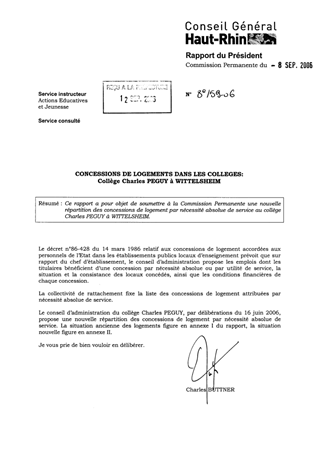 Ce rapport a pour objet de soumettre à la Commission Permanente une nouvelle répartition des concessions de logement par nécessité absolue de service au collège Charles PEGUY à WITTELSHEIM.