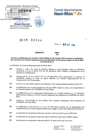 portant modification de l'arrêté n° 2014-0038 di 30.10.2014 portant nomination des membres du Comité Départemental des Retraités et personnes âgées du Haut-Rhin (C.O.D.E.R.P.A.) Resumé Pièces jointes ARRETE Assemblée : Non défini Date : 09/09/2016 Rapporteur : Non défini Collectivité : Conseil départemental du Haut-Rhin Direction : Non défini Service : Direction de la Solidarité Domaine : Autres (non classés) Commission :