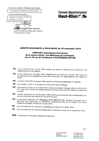 portant autorisation d'ouverture de la micro-crèche "Les Malicieux de l'artisanat", sis au 18 rue de l'Artisanat à BLOTZHEIM (68730) Resumé Pièces jointes ARRETE Assemblée : Non défini Date : 30/09/2016 Rapporteur : Non défini Collectivité : Conseil départemental du Haut-Rhin Direction : Non défini Service : Direction Enfance Santé Insertion Domaine : Accueil d'enfants Commission :