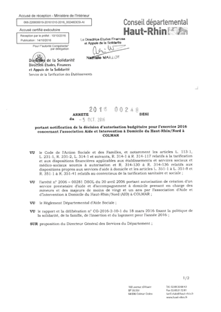 portant notification de la décision d'autorisation budgétaire de l'exercice 2016 concernant l'association aide et intervention à domicile du Haut-Rhin / Nord à COLMAR Resumé Pièces jointes ARRETE Assemblée : Non défini Date : 05/10/2016 Rapporteur : Non défini Collectivité : Conseil départemental du Haut-Rhin Direction : Non défini Service : Direction de la Solidarité Domaine : Dotations financières Commission :
