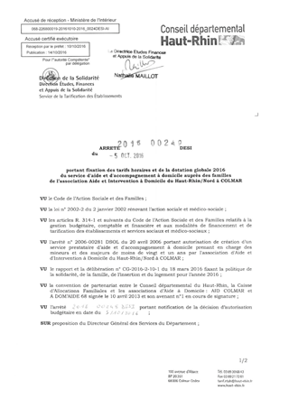 portant fixation des tarifs horaires et de la dotation globale 2016 du service d'aide et d'accompagnement à domicile auprès des familles de l'association aide et intervention à domicile du Haut-Rhin / Nord à COLMAR Resumé Pièces jointes ARRETE Assemblée : Non défini Date : 05/10/2016 Rapporteur : Non défini Collectivité : Conseil départemental du Haut-Rhin Direction : Non défini Service : Direction de la Solidarité Domaine : Dotations financières Commission :