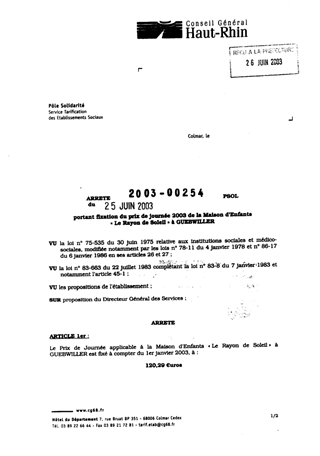 portant fixation du prix de journée 2003 de la Maison d'Enfants "Le Rayon de Soleil" à GUEBWILLER. Resumé Pièces jointes ARRETE Assemblée : Non défini Date : 25/06/2003 Rapporteur : Non défini Collectivité : Conseil départemental du Haut-Rhin Direction : Non défini Service : Service de la Tarification des Etablissements Domaine : Prix de Journée Commission :