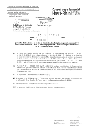 portant notification de la décision d'autorisation budgétaire pour l'exercice 2016 concernant le service d'aide et d'accompagnement à domicile auprès des familles de la fédération ADMR Alsace Resumé Pièces jointes ARRETE Assemblée : Non défini Date : 05/10/2016 Rapporteur : Non défini Collectivité : Conseil départemental du Haut-Rhin Direction : Non défini Service : Direction de la Solidarité Domaine : Dotations financières Commission :